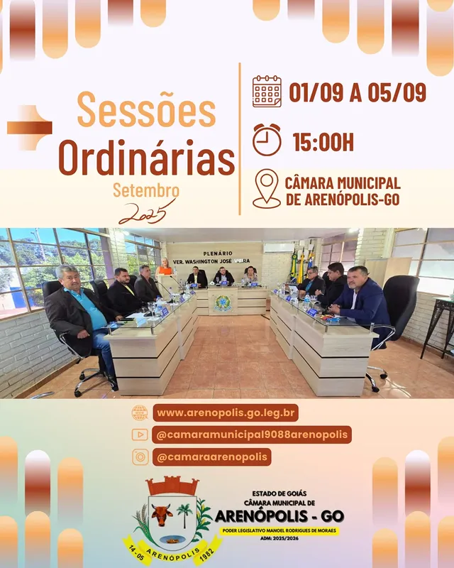 📍 Câmara Municipal de Arenópolis-GO🗓️ De 01 a 05 de setembro⏰ Sempre às 15h ✨ Sua participação fortalece nossa democracia!