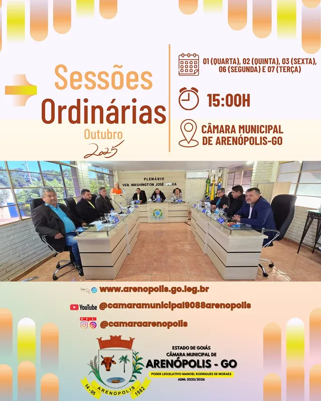🗓 Dias 01, 02, 03, 06 e 07 de outubro📍 Plenário da Câmara Municipal Venha acompanhar de perto as decisões que constroem o futuro da nossa cidade.✅ Participe! Sua presença fortalece a democracia.
